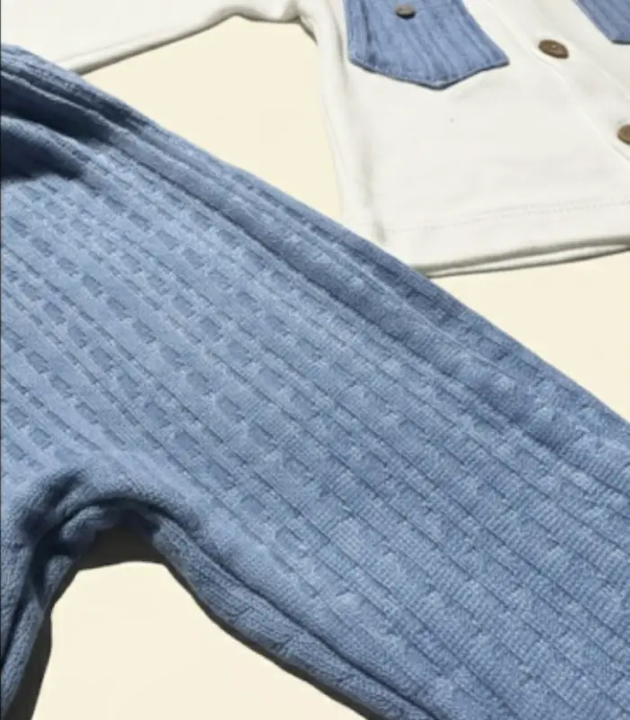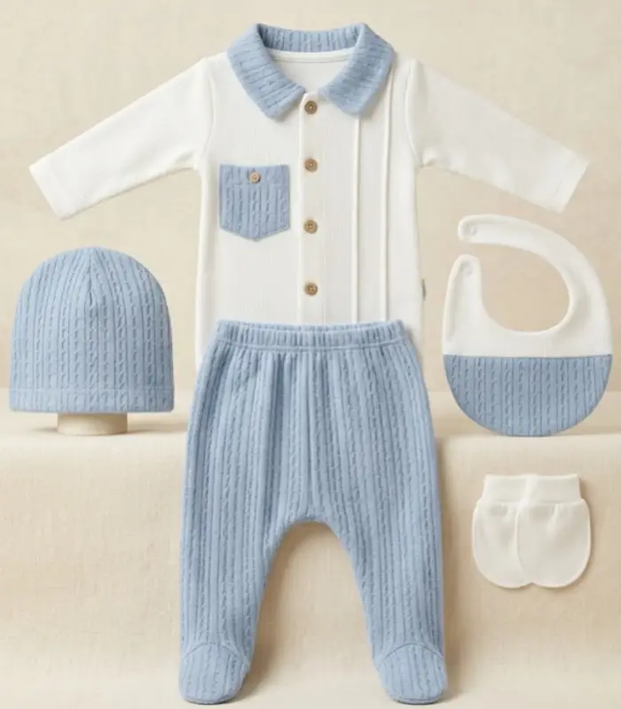 Celebrate your little one’s arrival with this thoughtfully curated 5-piece baby clothing set. Every item, from the stylish button-up jacket to the cozy footed trousers, is crafted from premium, high-quality fabric that feels exceptionally gentle against delicate newborn skin. The soft cream and powder-blue color palette provides a classic, elegant look, making this set ideal for everyday wear or special family moments.